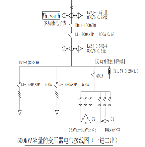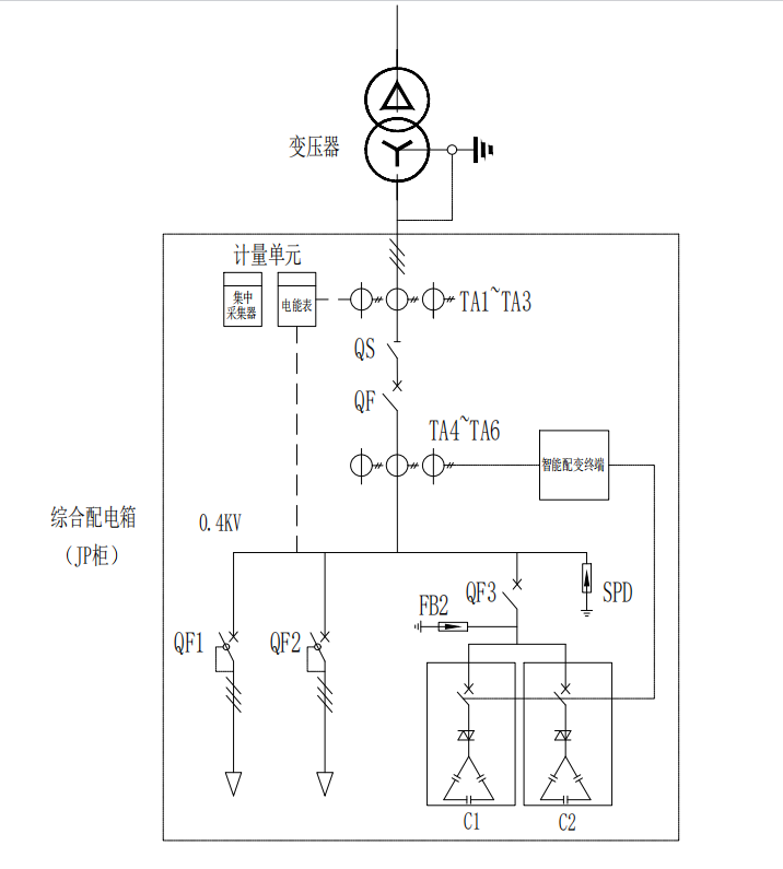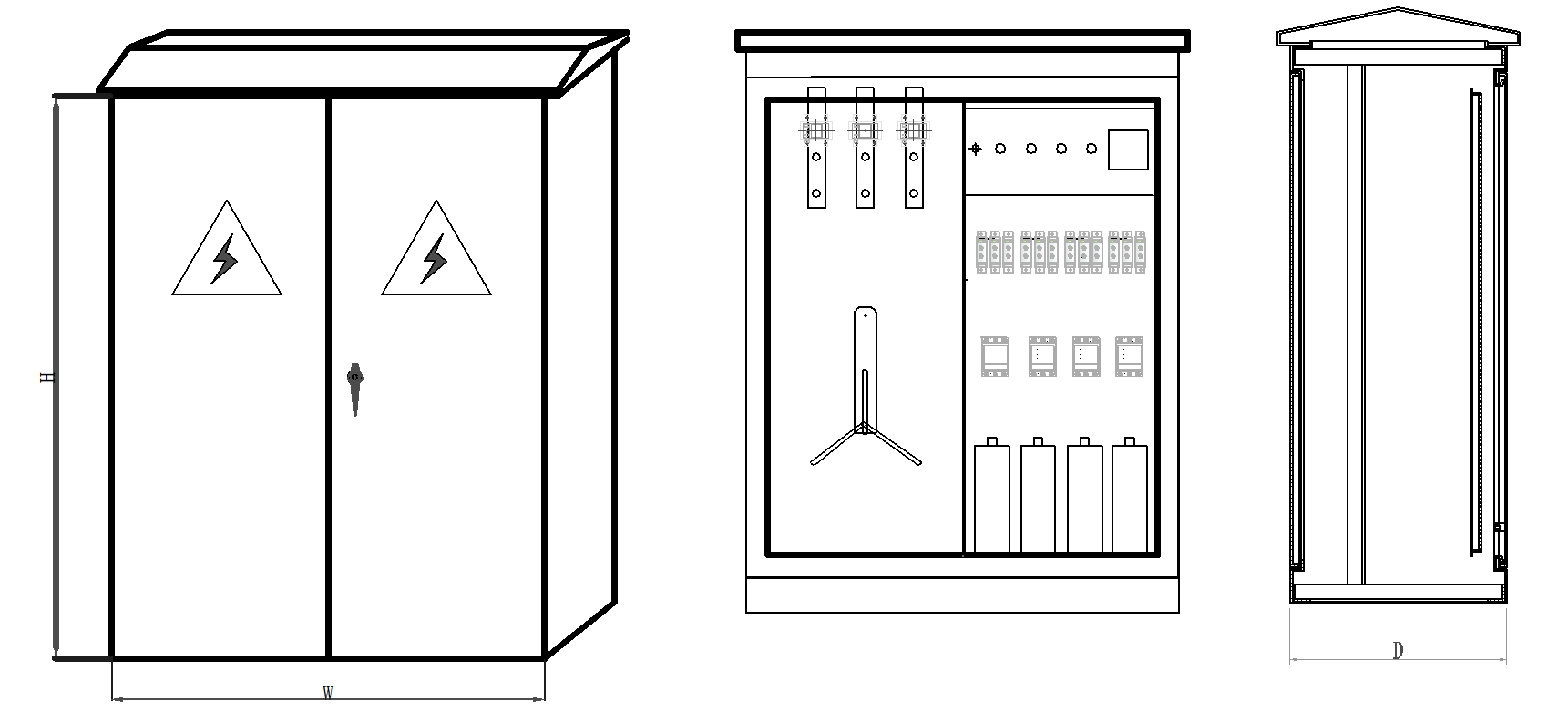 电能分配:内部安装进线刀熔开关,出线断路器,进线刀熔开关容量与出线断路器容量及路数满足配变容量和供电要求;